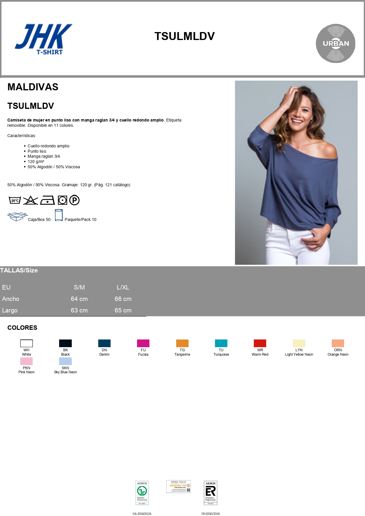 Camiseta de mujer en punto liso con manga raglan 3/4 y cuello redondo amplio. Etiqueta removible. Disponible en 11 colores.