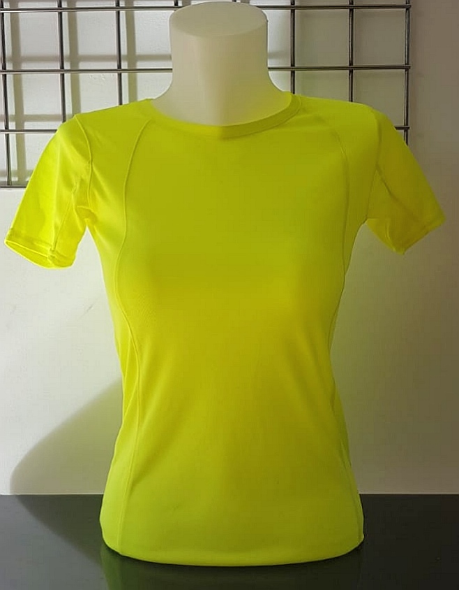 Camiseta deportiva para mujer de manga corta, ligeramente entallada, con costura decorativa en frente, espalda y mangas. Etiqueta removible. Disponible en 12 colores y desde la talla S hasta la XXL.