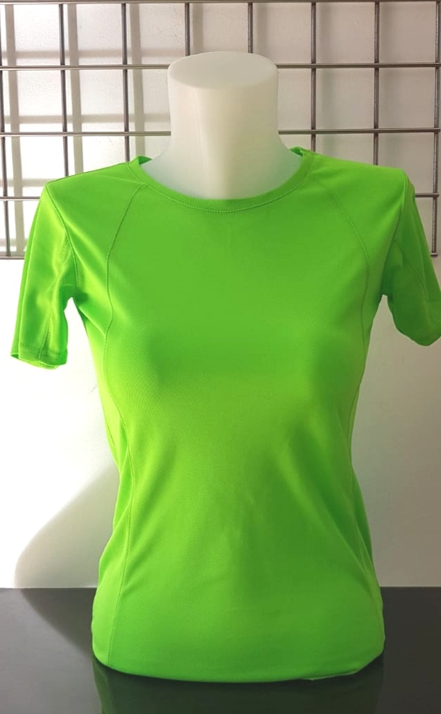 Camiseta deportiva para mujer de manga corta, ligeramente entallada, con costura decorativa en frente, espalda y mangas. Etiqueta removible. Disponible en 12 colores y desde la talla S hasta la XXL.